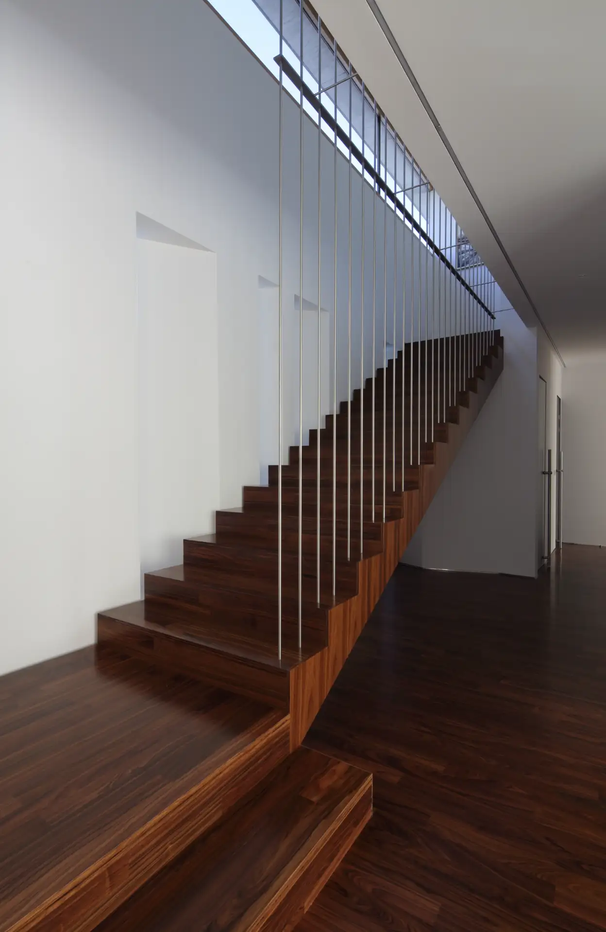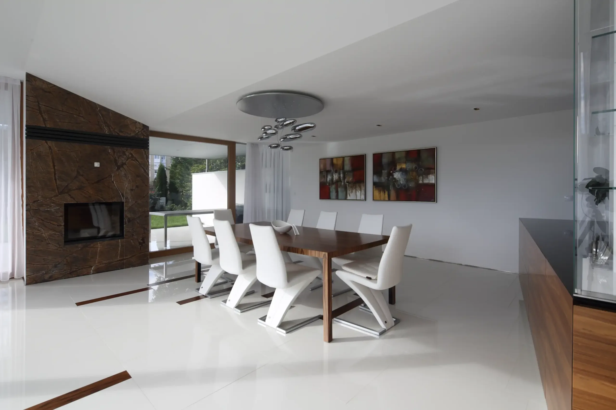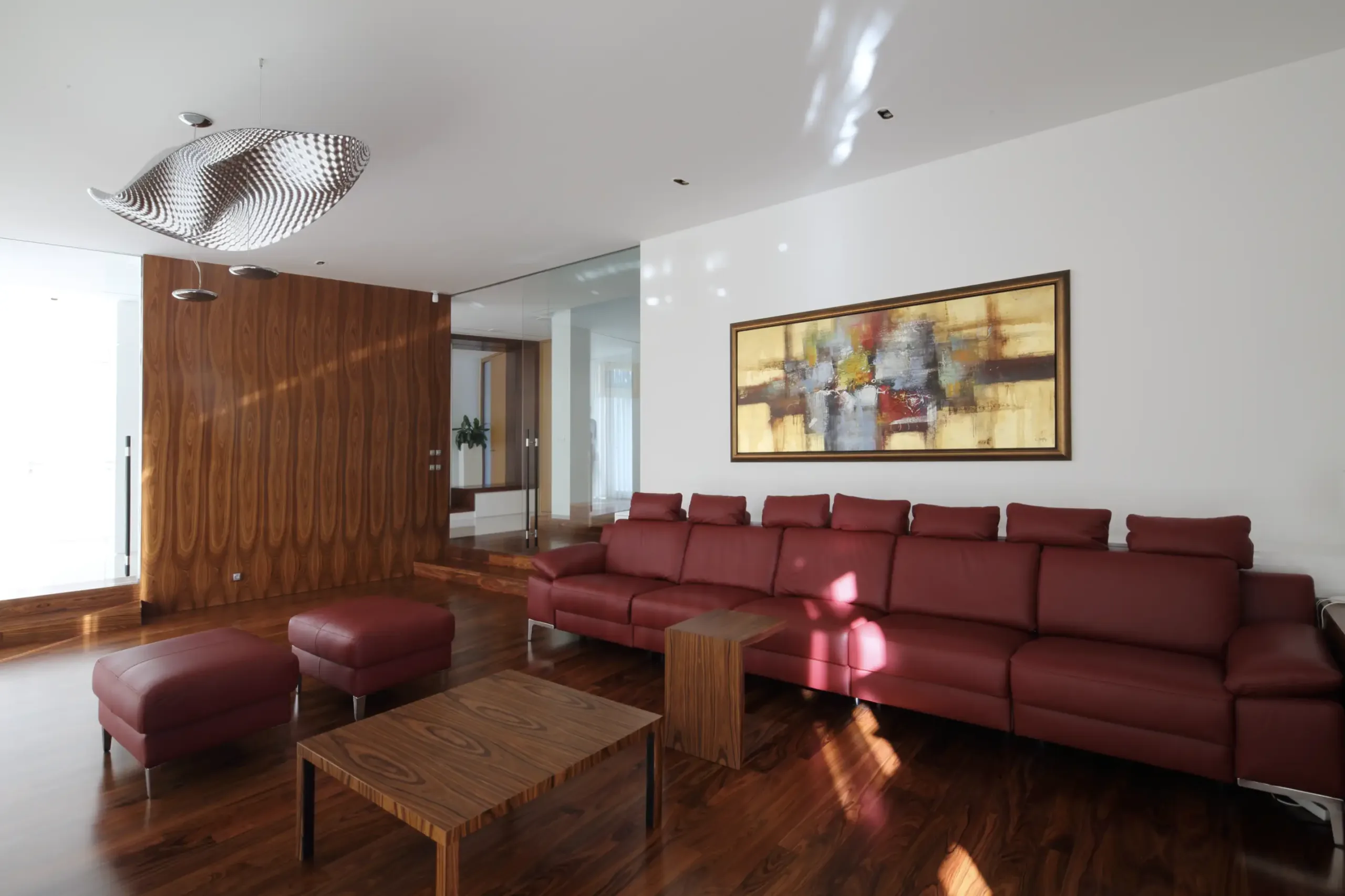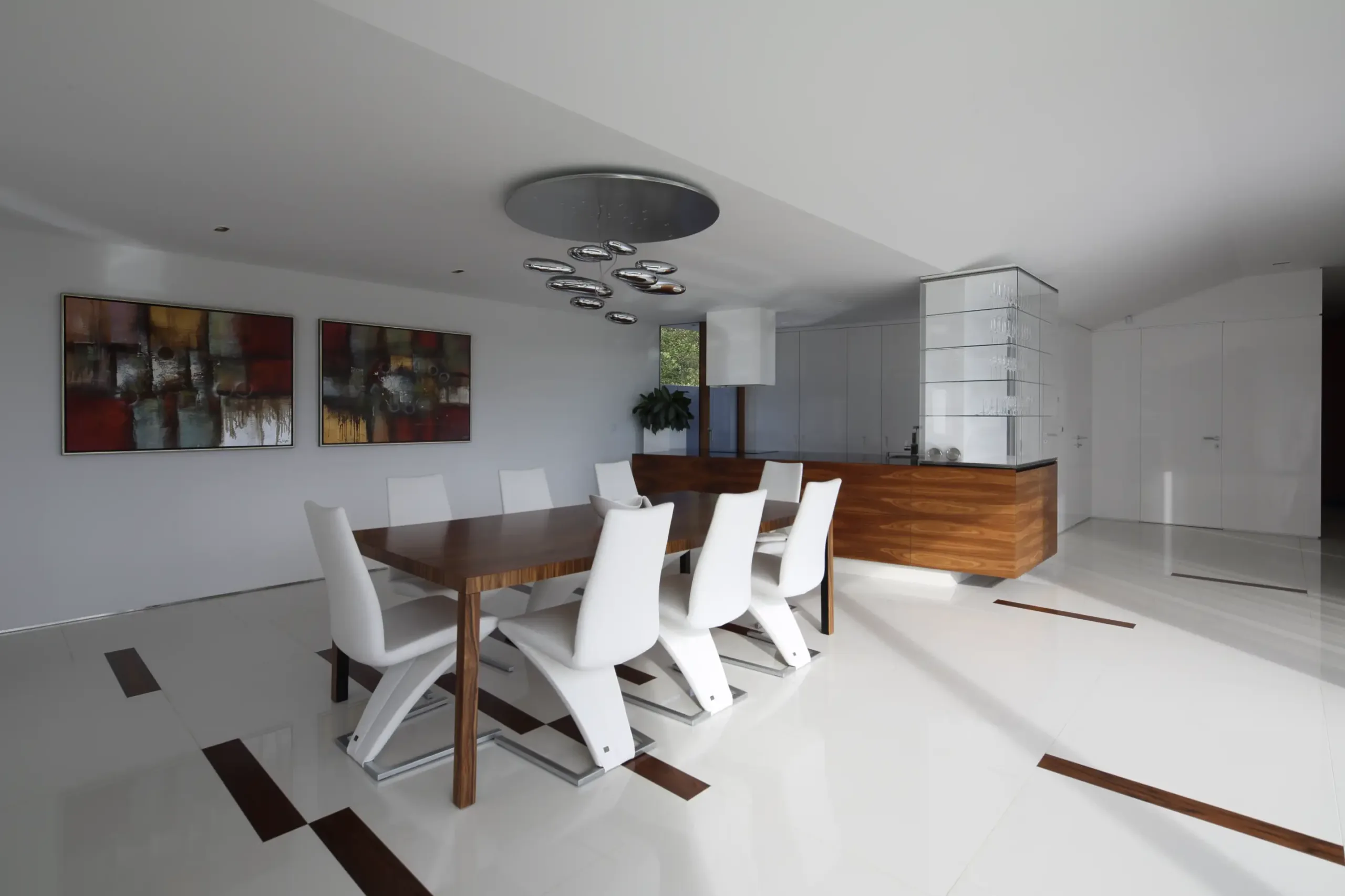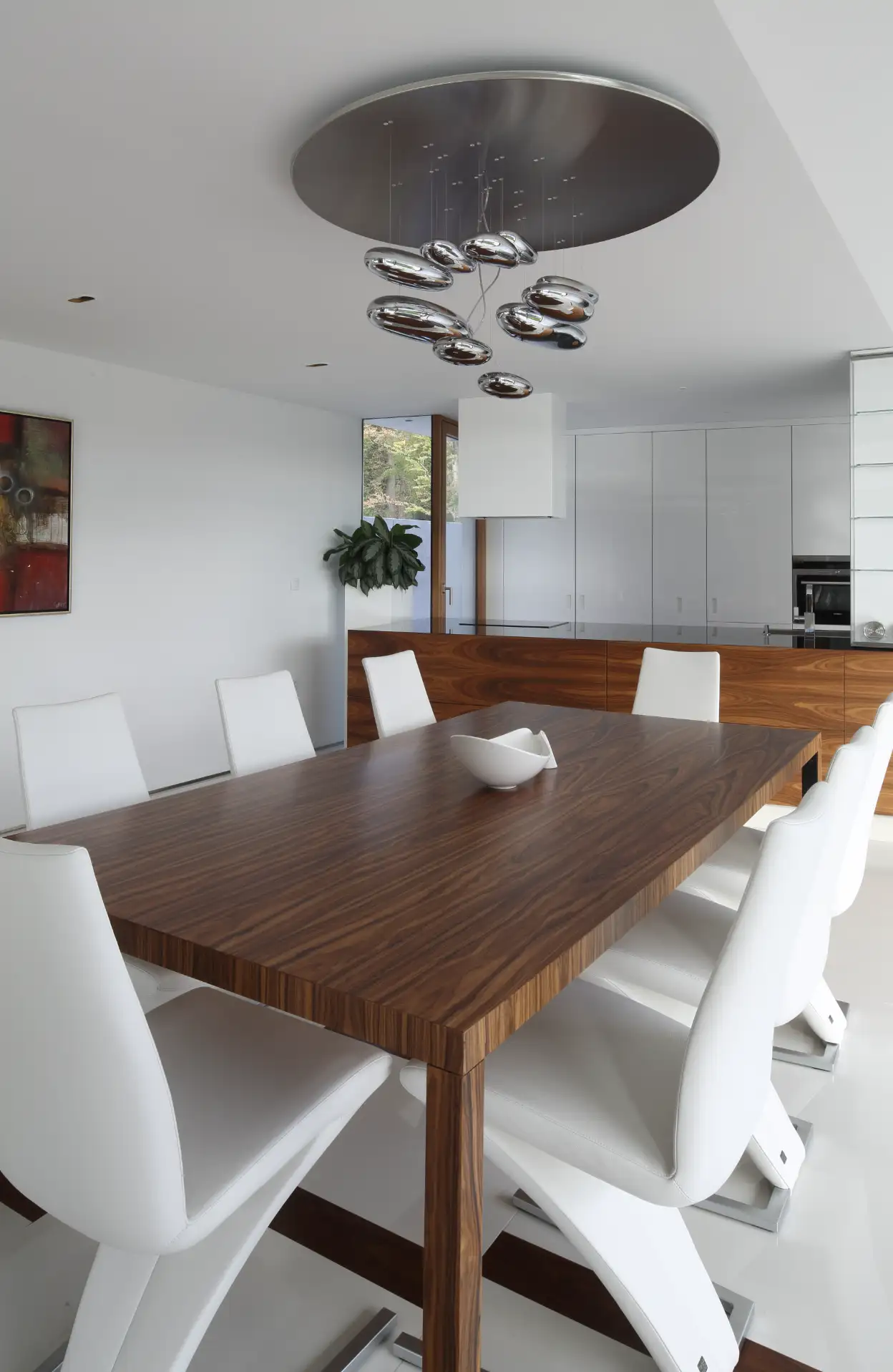 Prostori so zasnovani tako, da naravna svetloba prodira skozi velike steklene površine ter poudarja kontraste med belimi elementi in intenzivnim furnirjem palisandra katerega smo uporabili v vseh bivalnih prostorih.