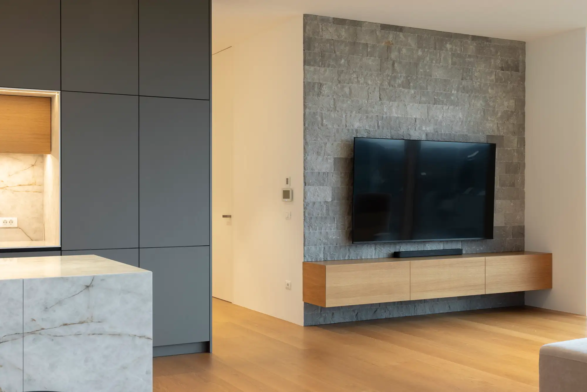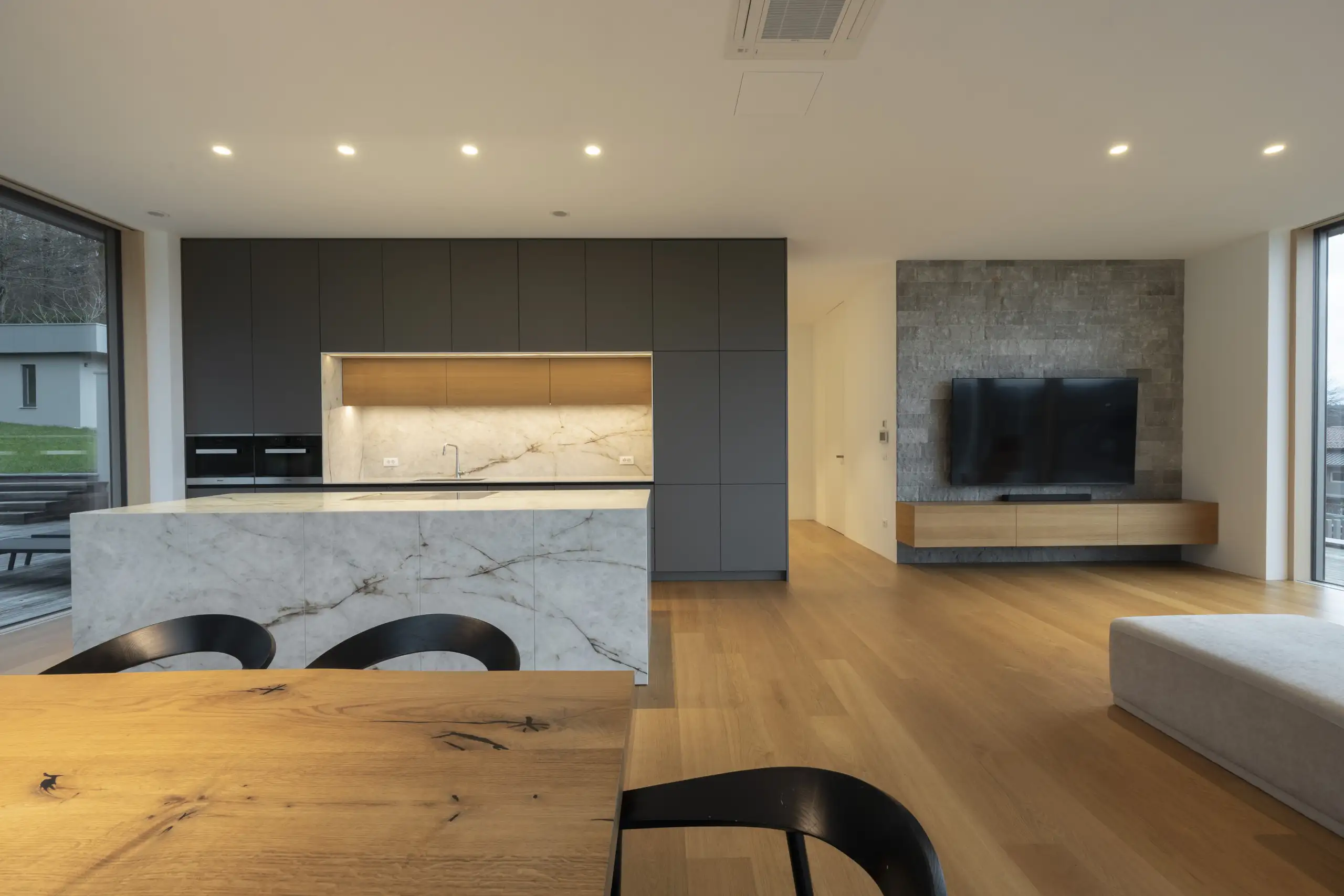 Srce doma je prefinjena kuhinja minimalističnega videza. Elementi iz kamna s subtilnim vzorcem, dajejo prostoru doda občutek razkošja.