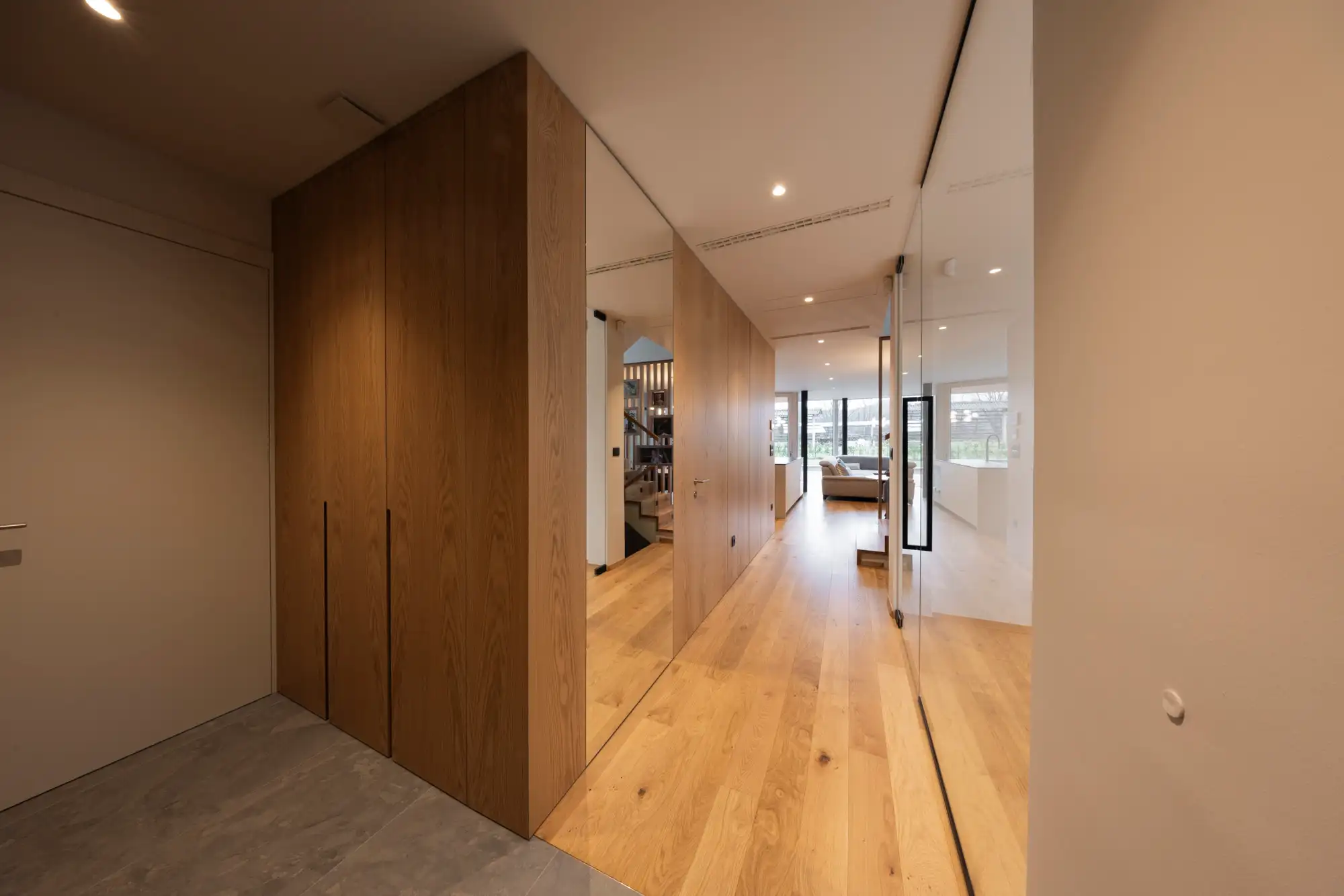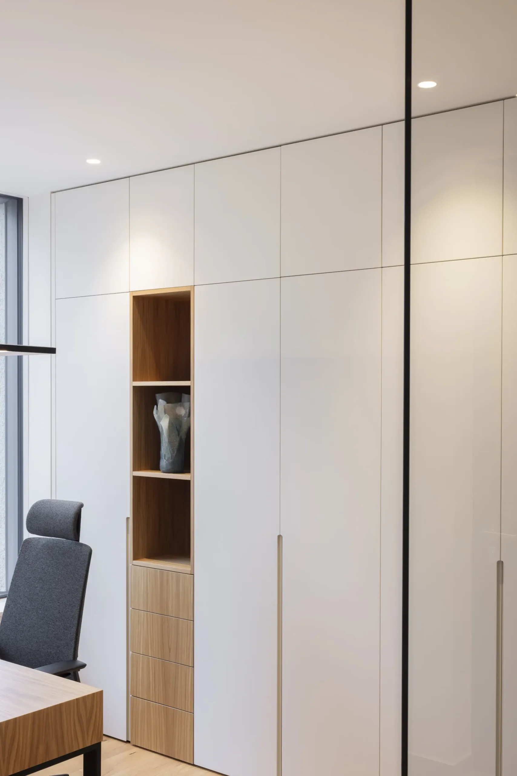 Osrednji poudarek je na umetelni uporabi furnirja in njegovi sestavi, ki prostoru doda edinstven karakter.