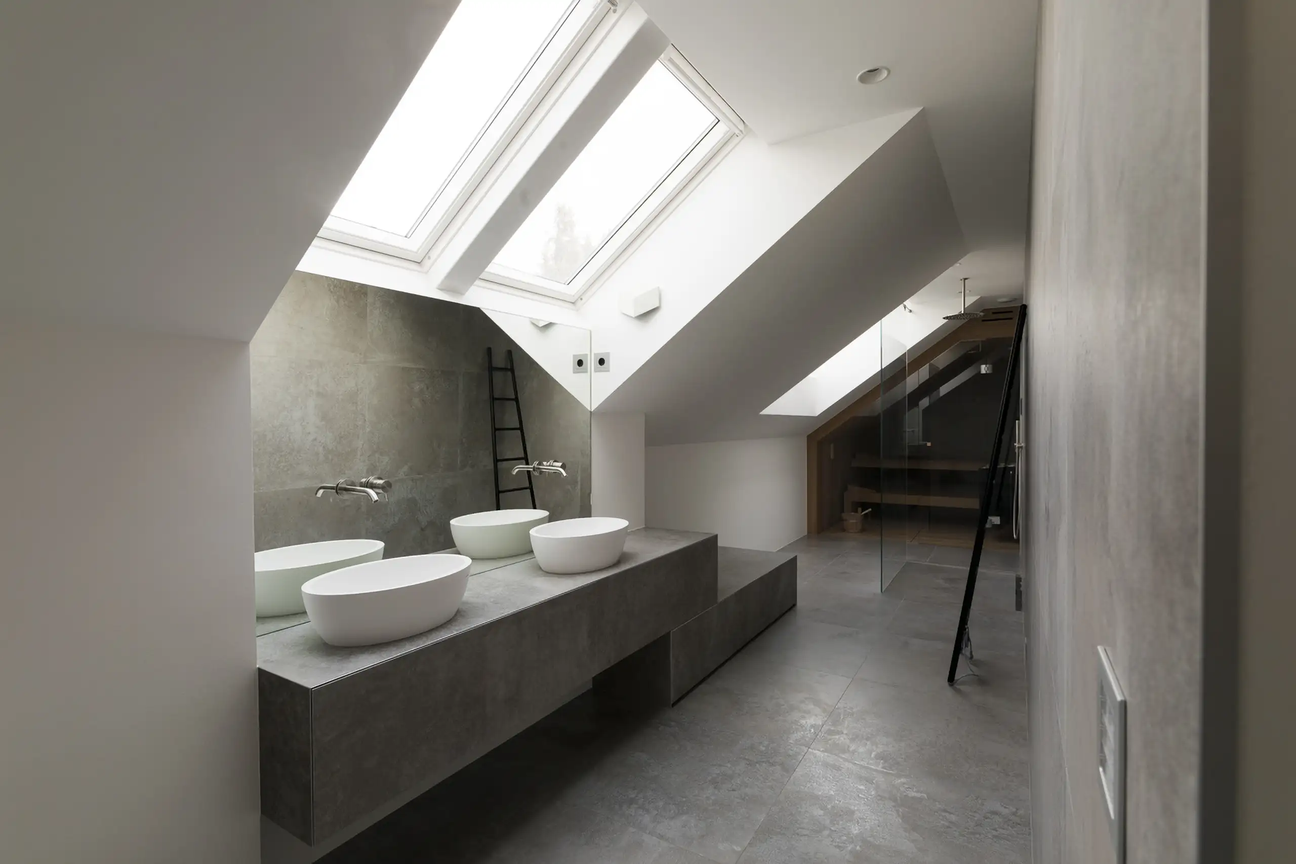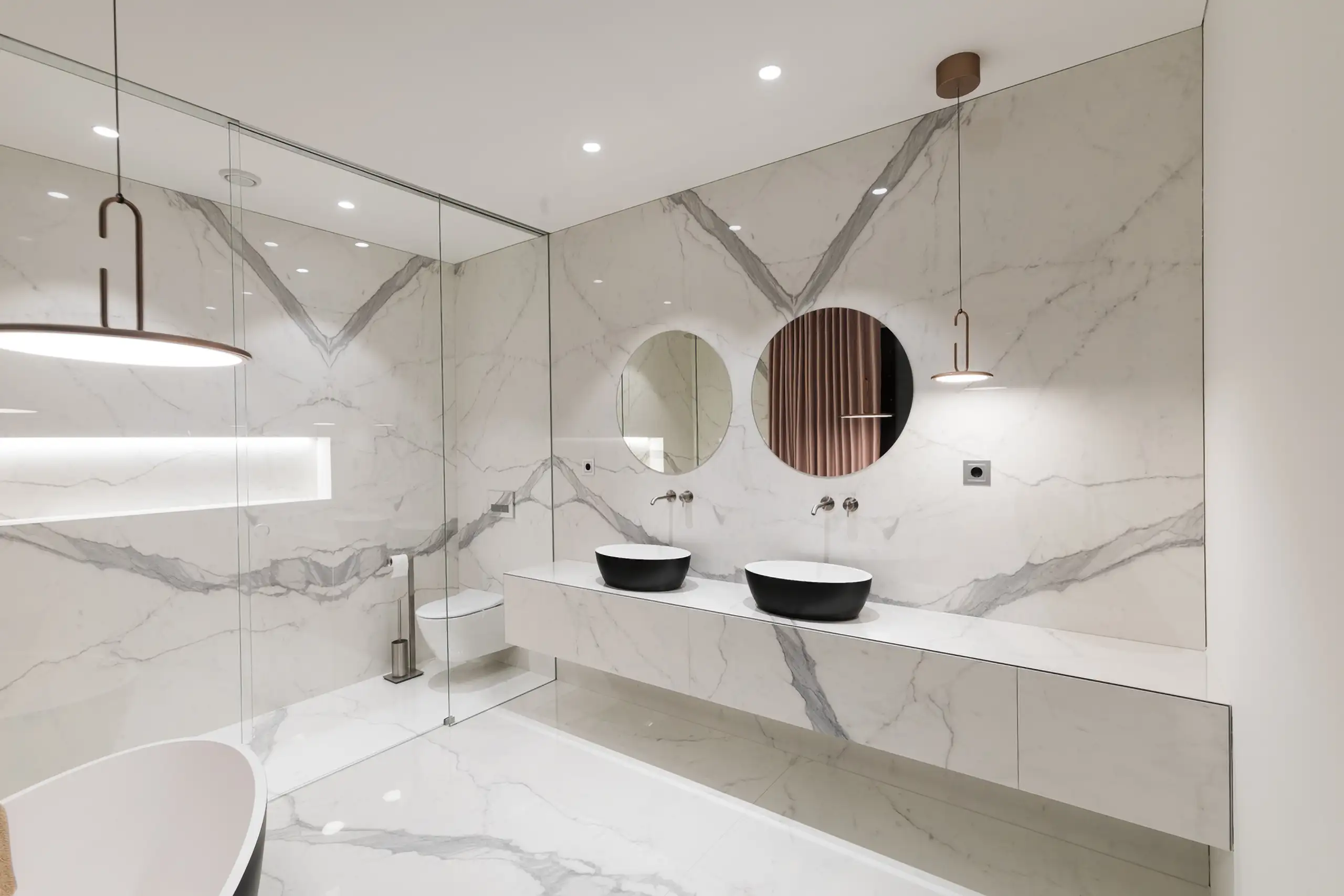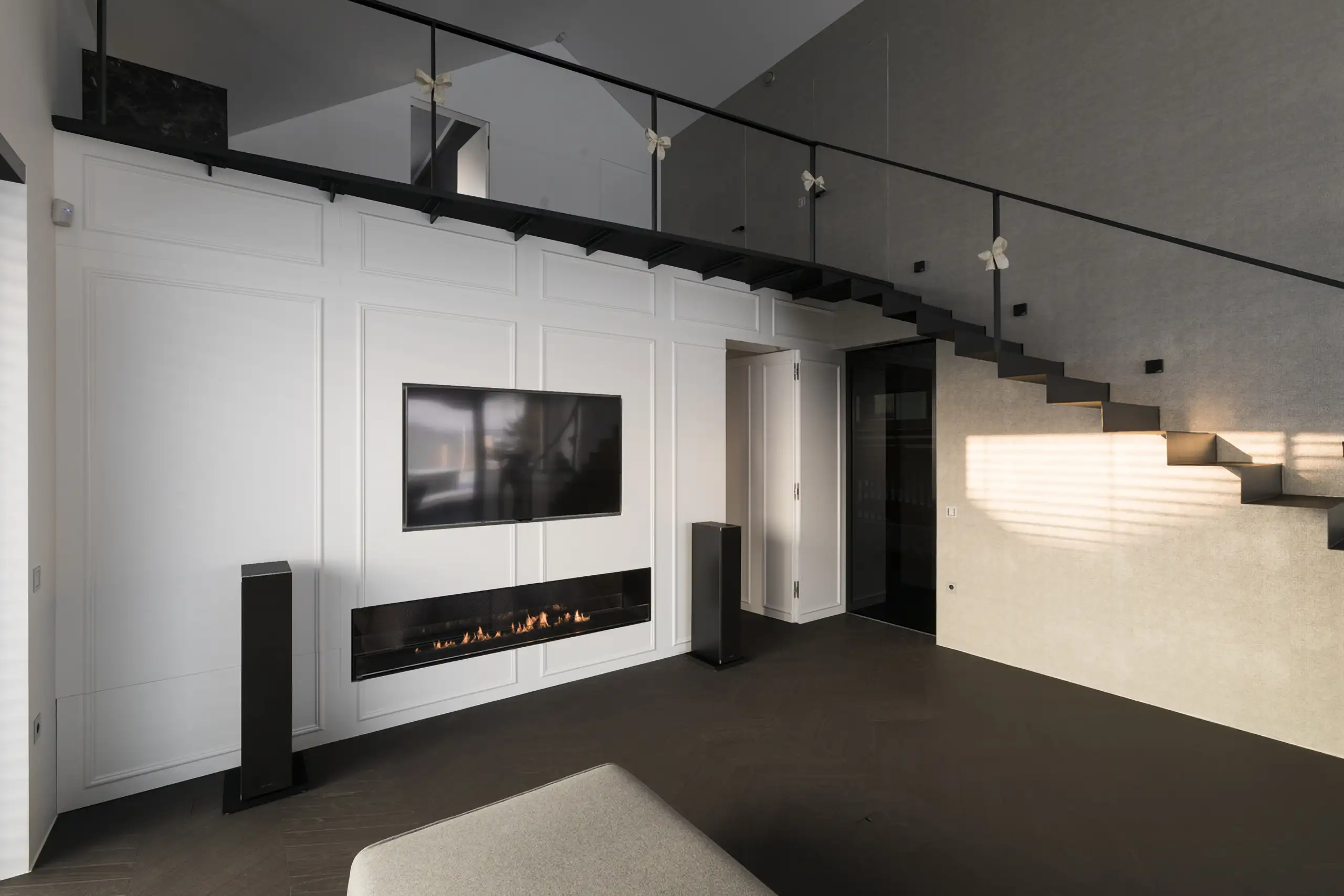 Notranjost hiše zaznamujejo dovršeni detajli. V hiši smo uporabili več stilov od modernega, ki je viden v predsobi do art deco kuhinje in dnevne sobe. Ta zasnova ustvarja občutek masivnosti, brez vizualne teže. Kuhinjski otok iz kamna deluje kot osrednji element prostora, ki združuje funkcionalnost in estetiko. Celoten interier gradi umirjen ambient, v katerem se arhitektura in oprema naravno prepletata.