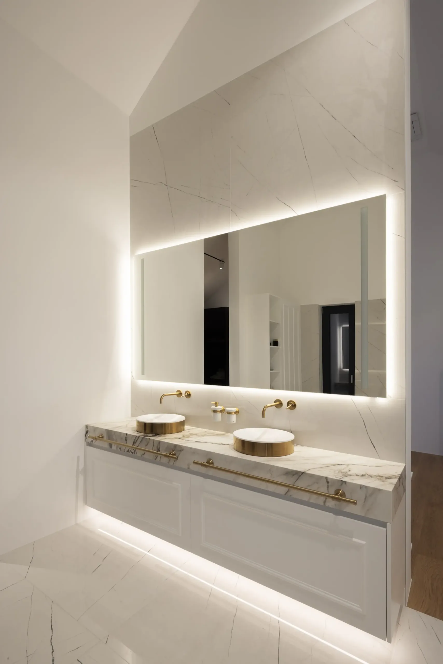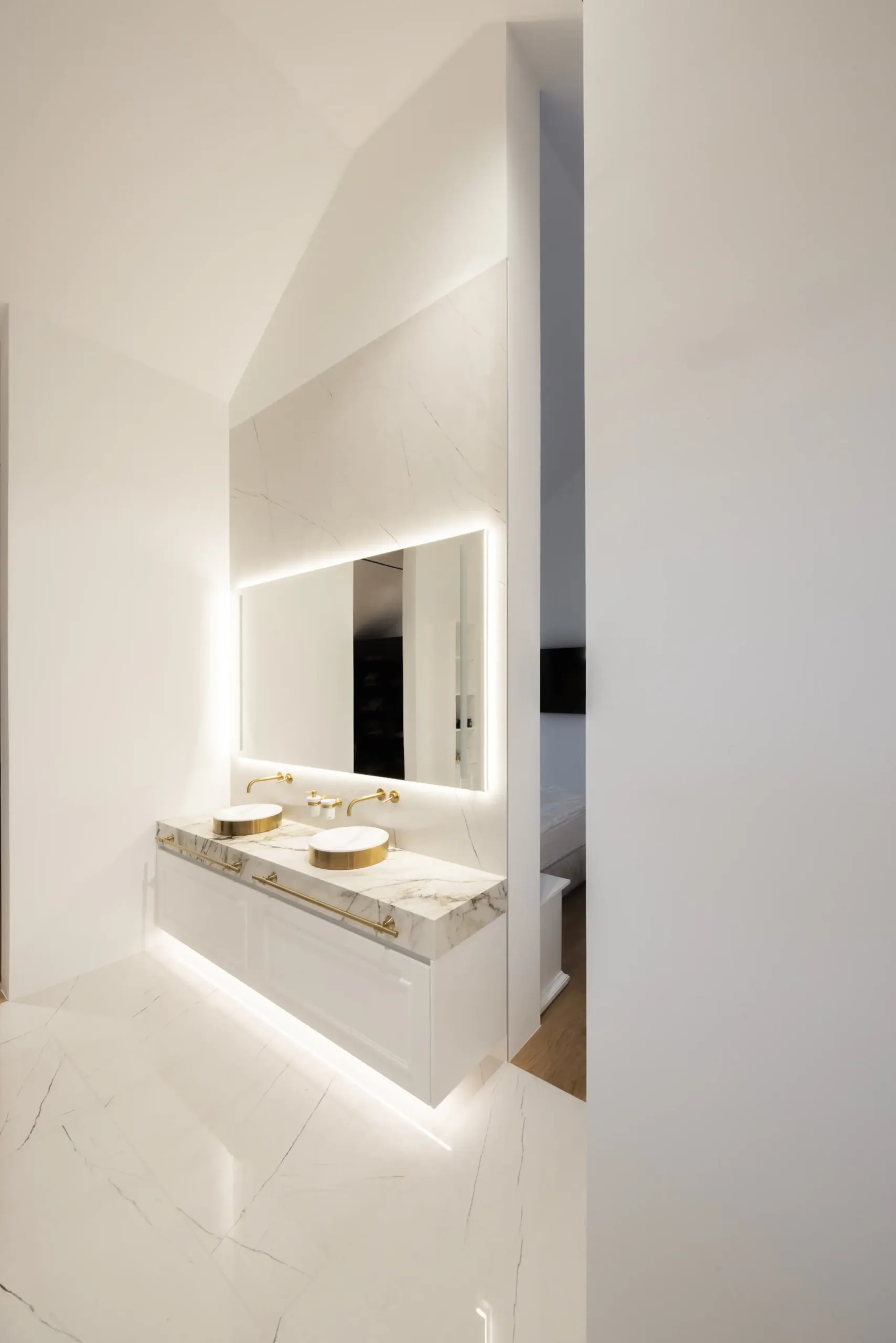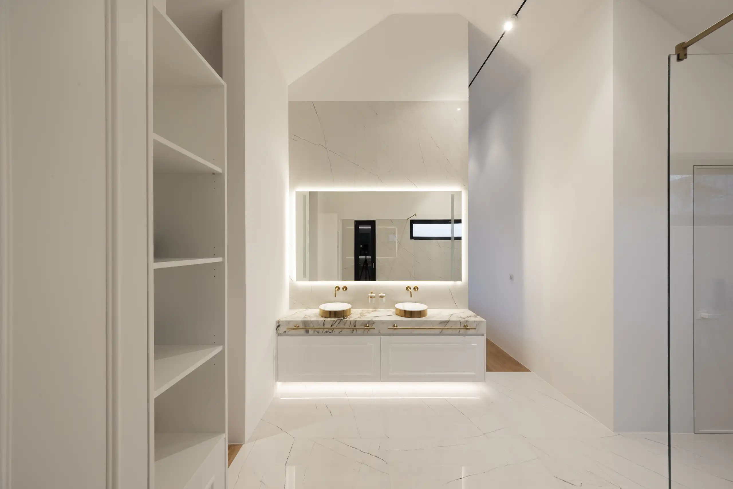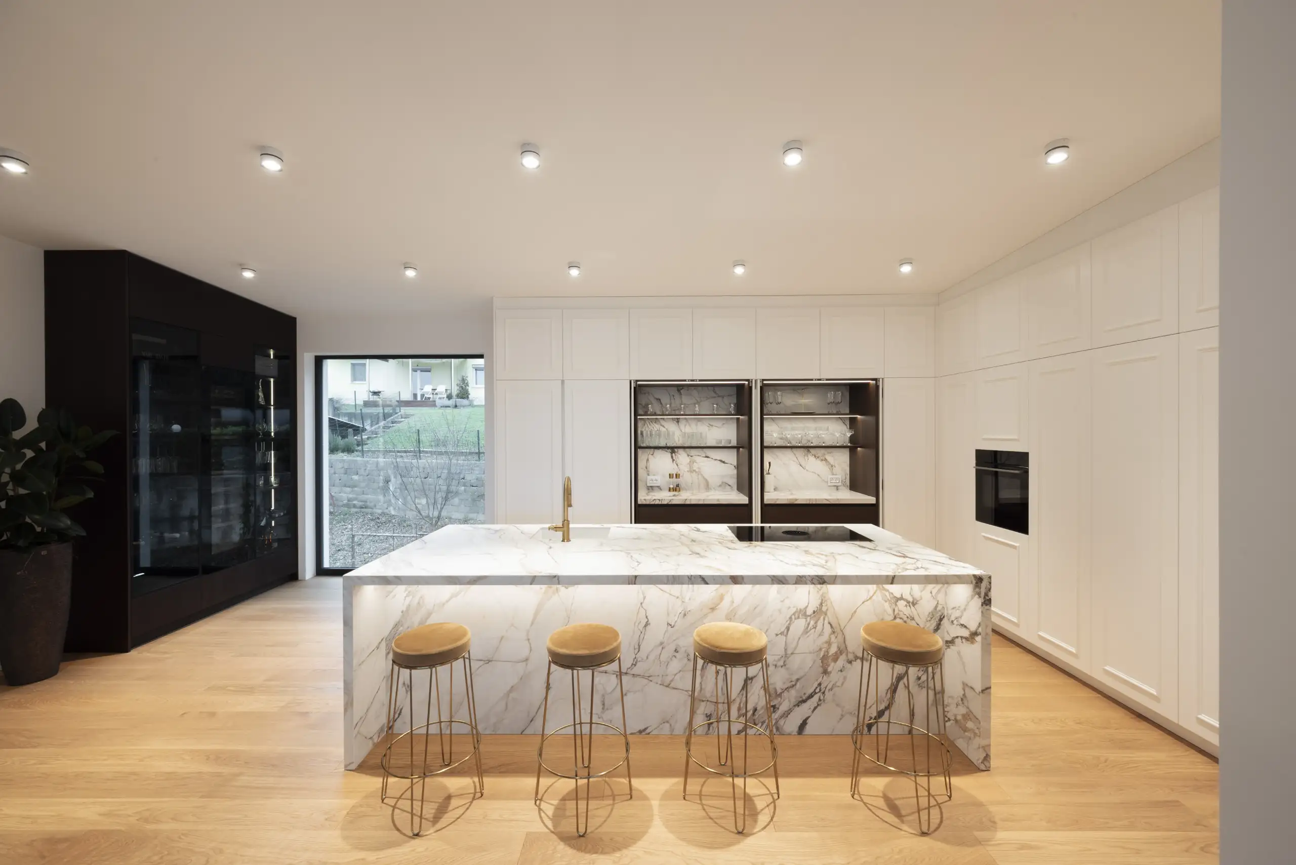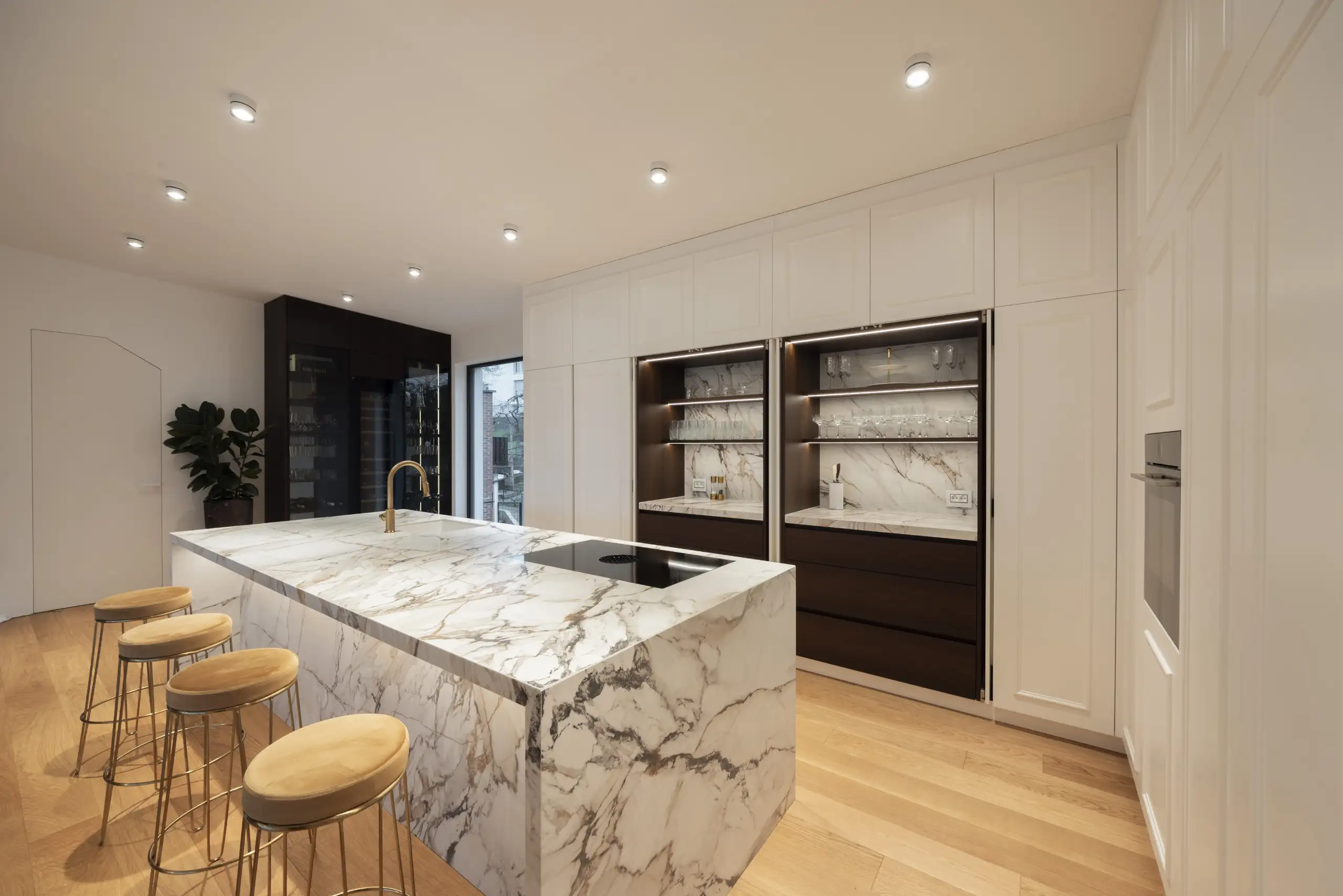 Notranjost hiše odraža brezčasno eleganco, kjer se minimalistični detajli srečajo z bogato materialnostjo. V kuhinji dominirajo bele ličnice, ki ustvarjajo čist in umirjen videz ter delujejo kot nevtralno ozadje za poudarjene naravne teksture.