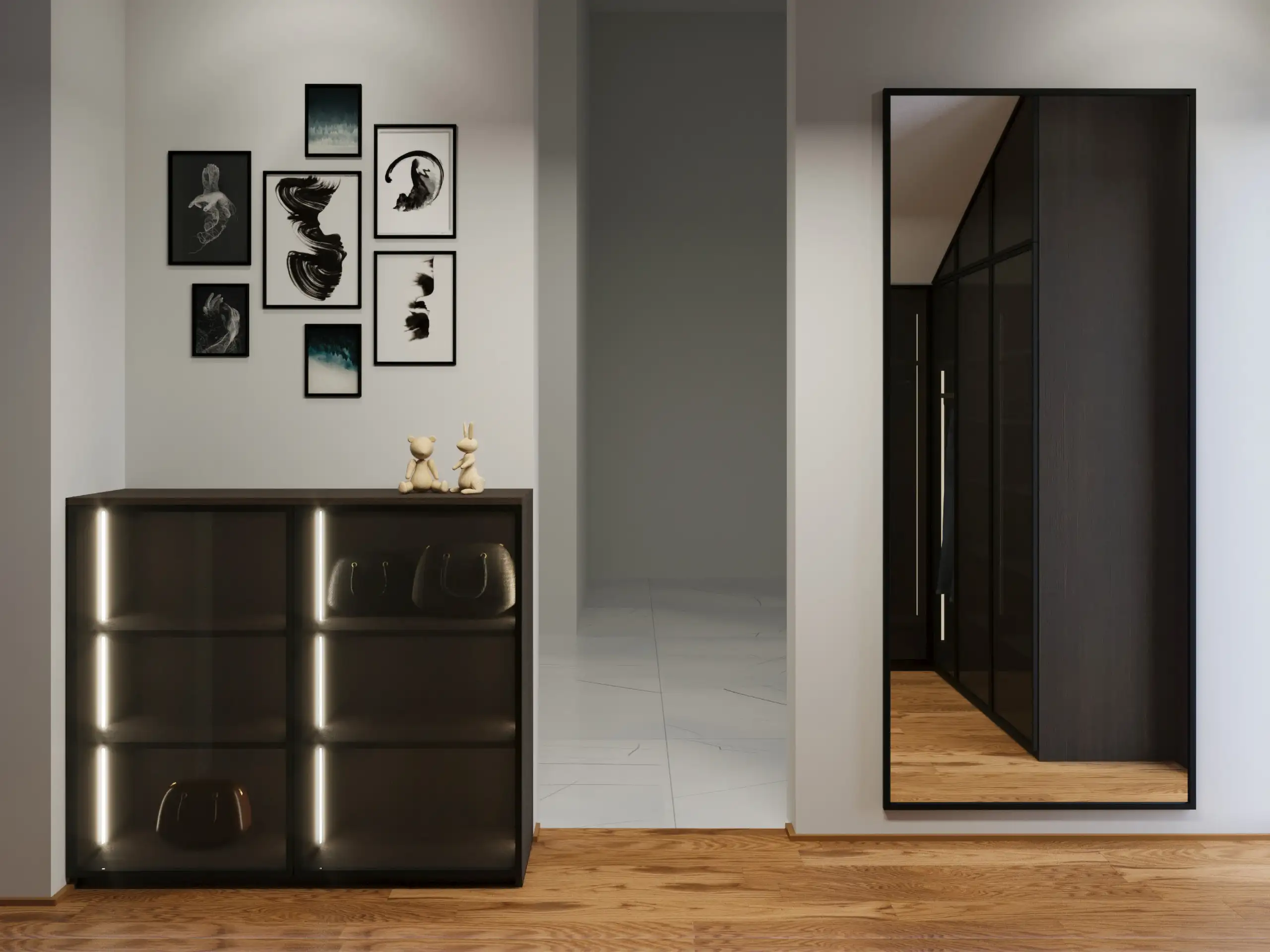 Vitrina in njena notranjost sta obloženi z orehovim furnirjem, ki v prostor vnese toplino in bogato teksturo naravnega lesa.