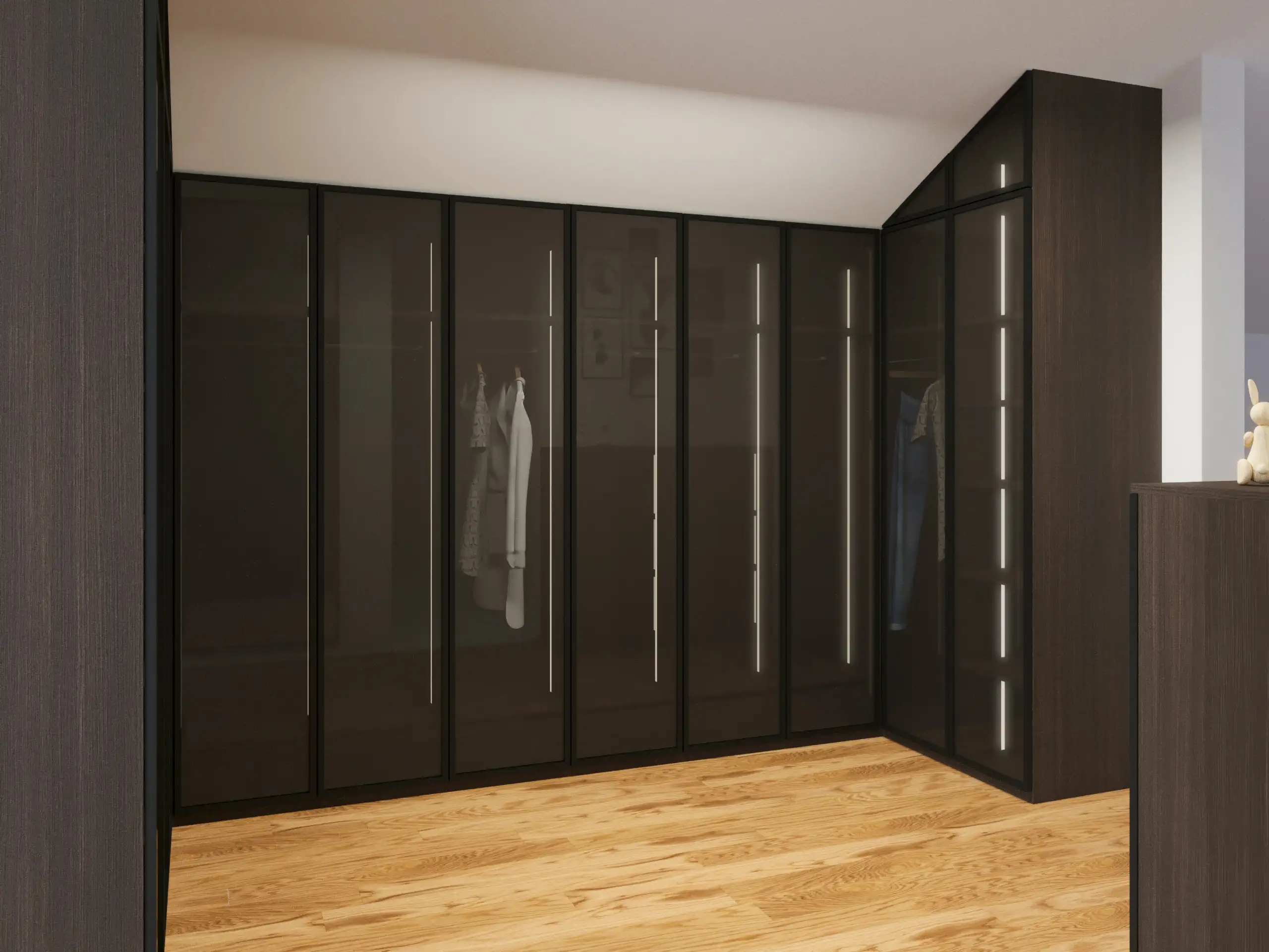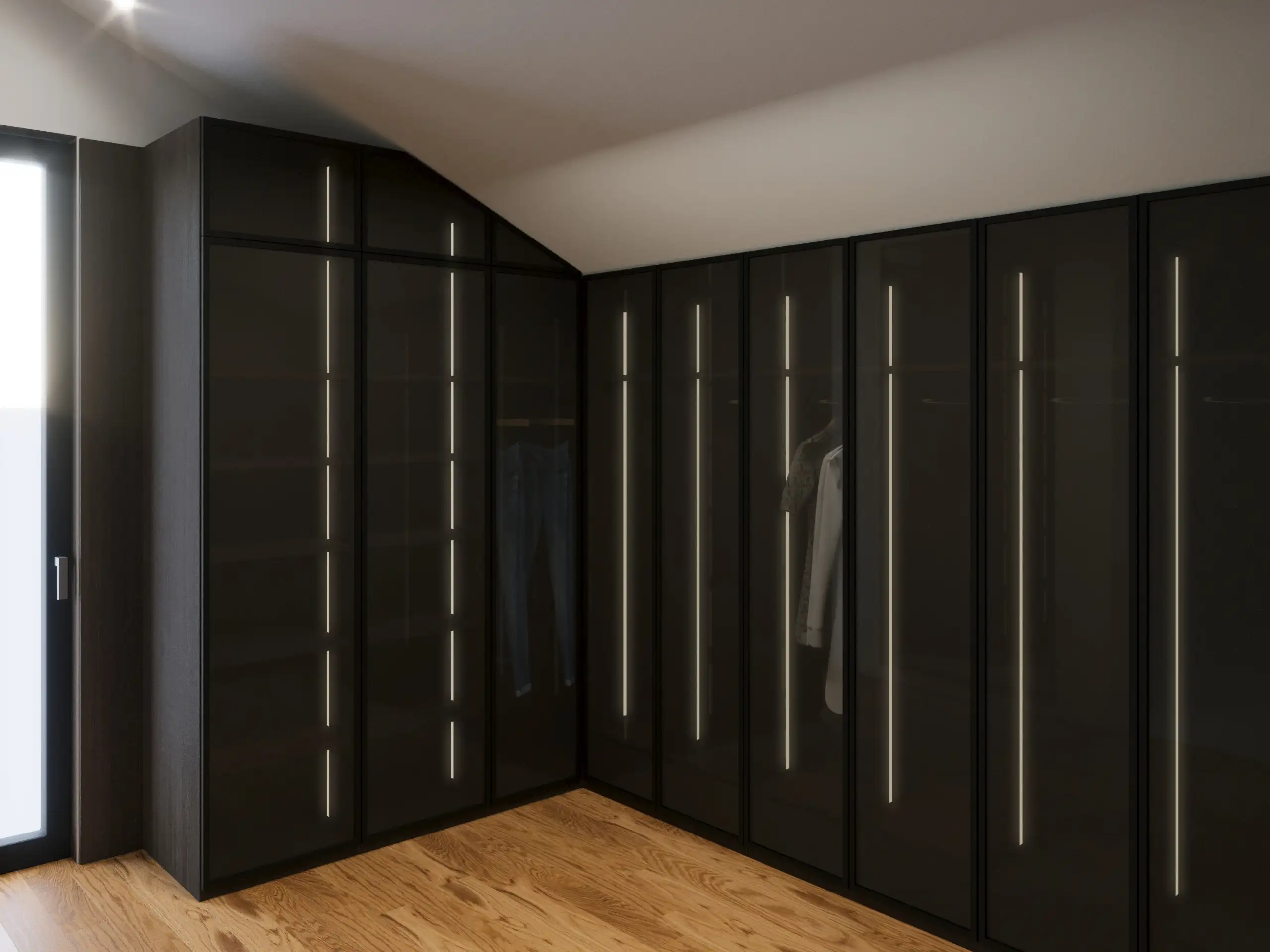 Za večjo estetsko celovitost in funkcionalnost je v kuhinji dvakrat uporabljen sistem Hawa za odpiranje vrat, ki omogoča popolno zapiranje in s tem popolnoma diskreten videz — ko so vrata zaprta, se vsi elementi elegantno skrijejo v ravnino stene.