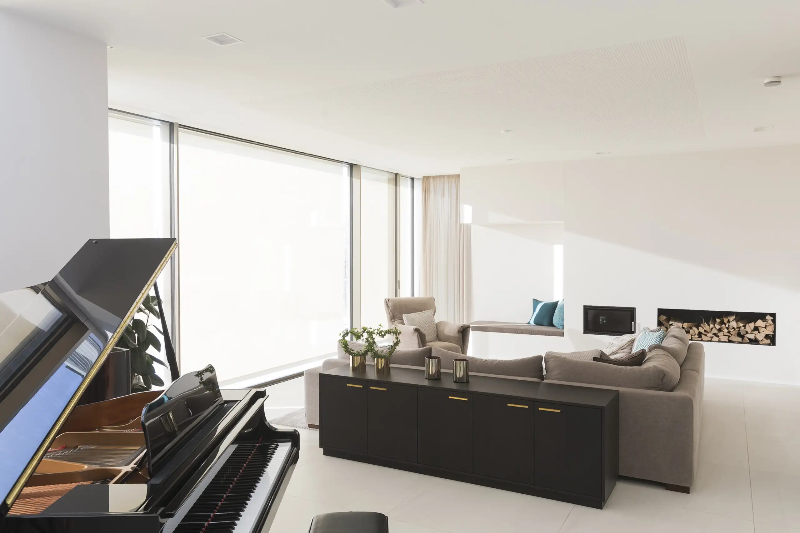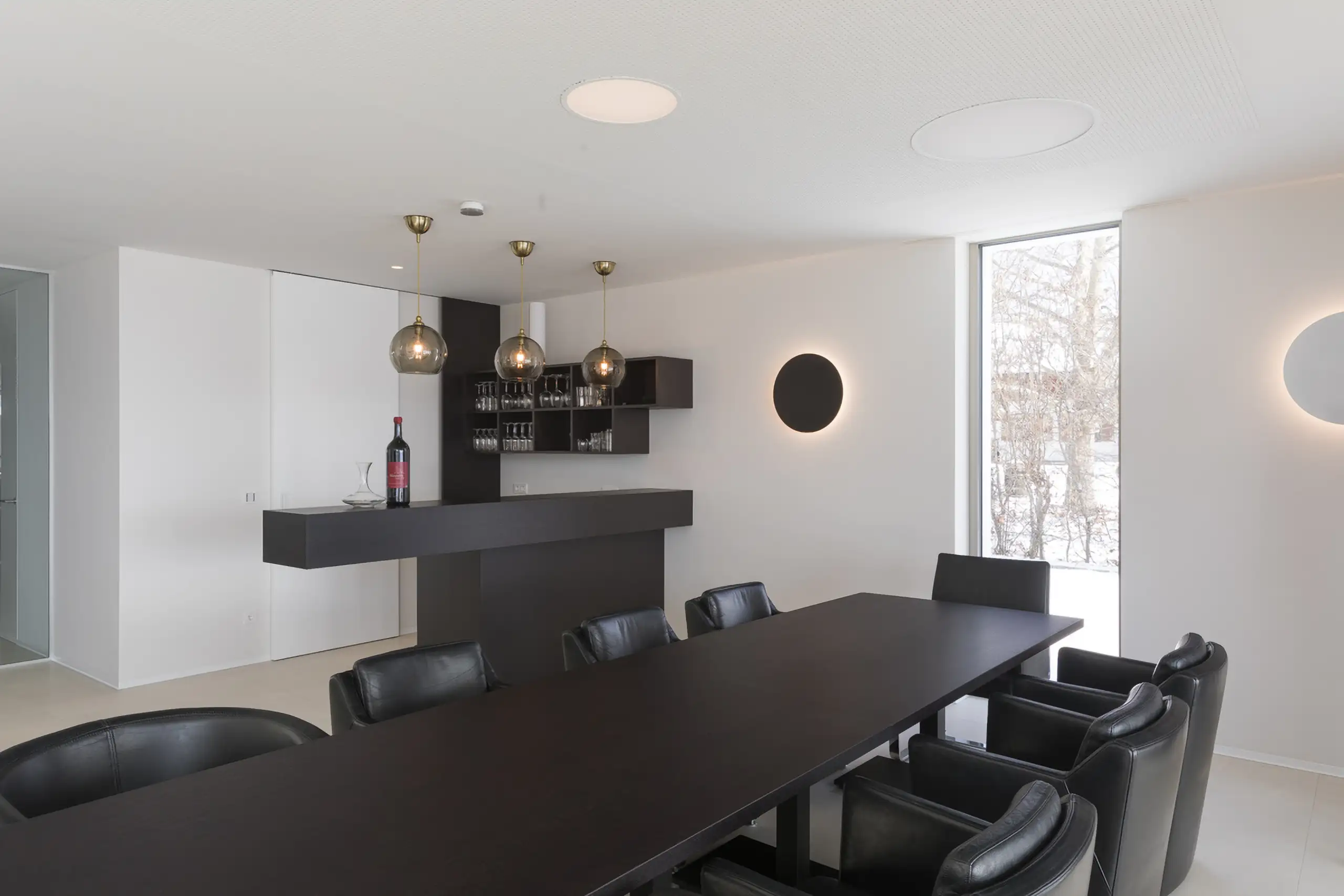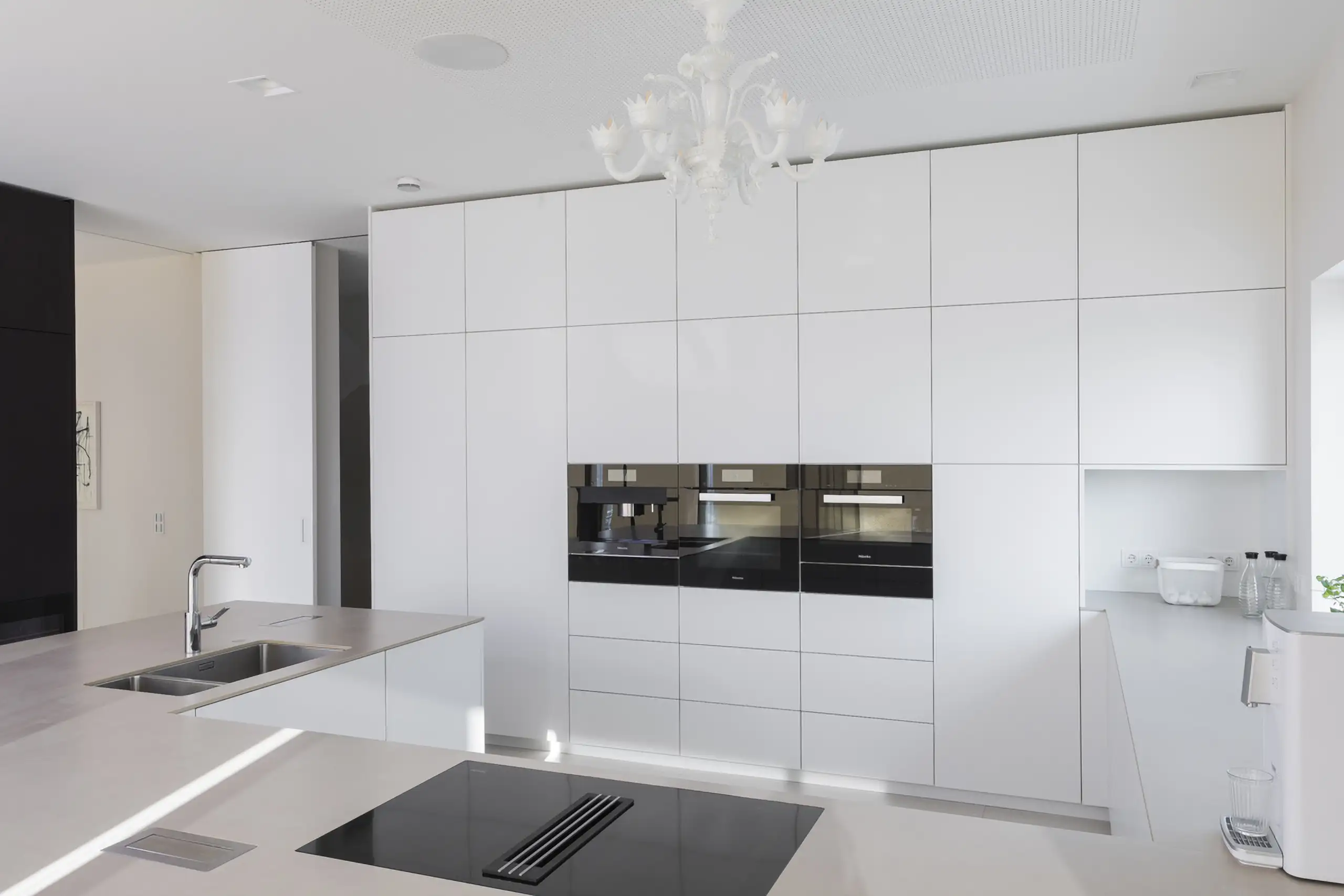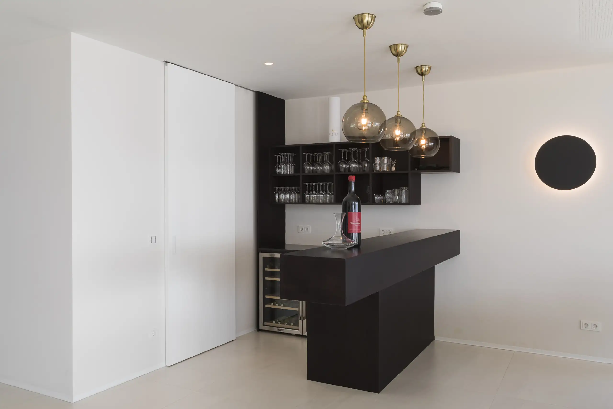 Neizpeta kombinacija bele in temnega furnirja tvori brezčasno osnovo, ki jo dopolnjujejo natančno izvedeni spoji robov posameznih elementov. Elegantne linije delujejo sodobno in prefinjeno, njihovo lahkotnost pa uravnoteža masivnost kubusnih pultov, ki prostoru dodajo stabilnost.