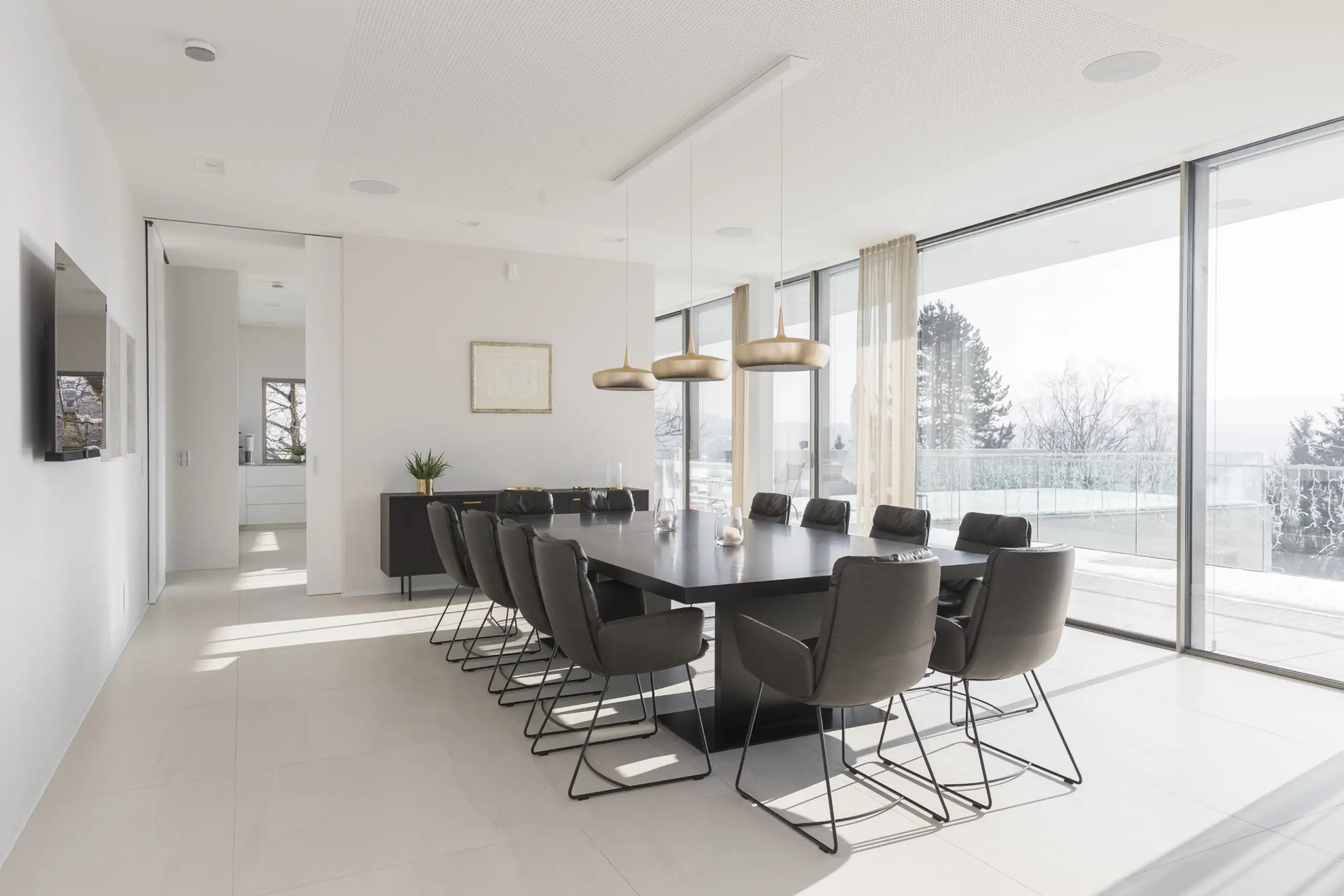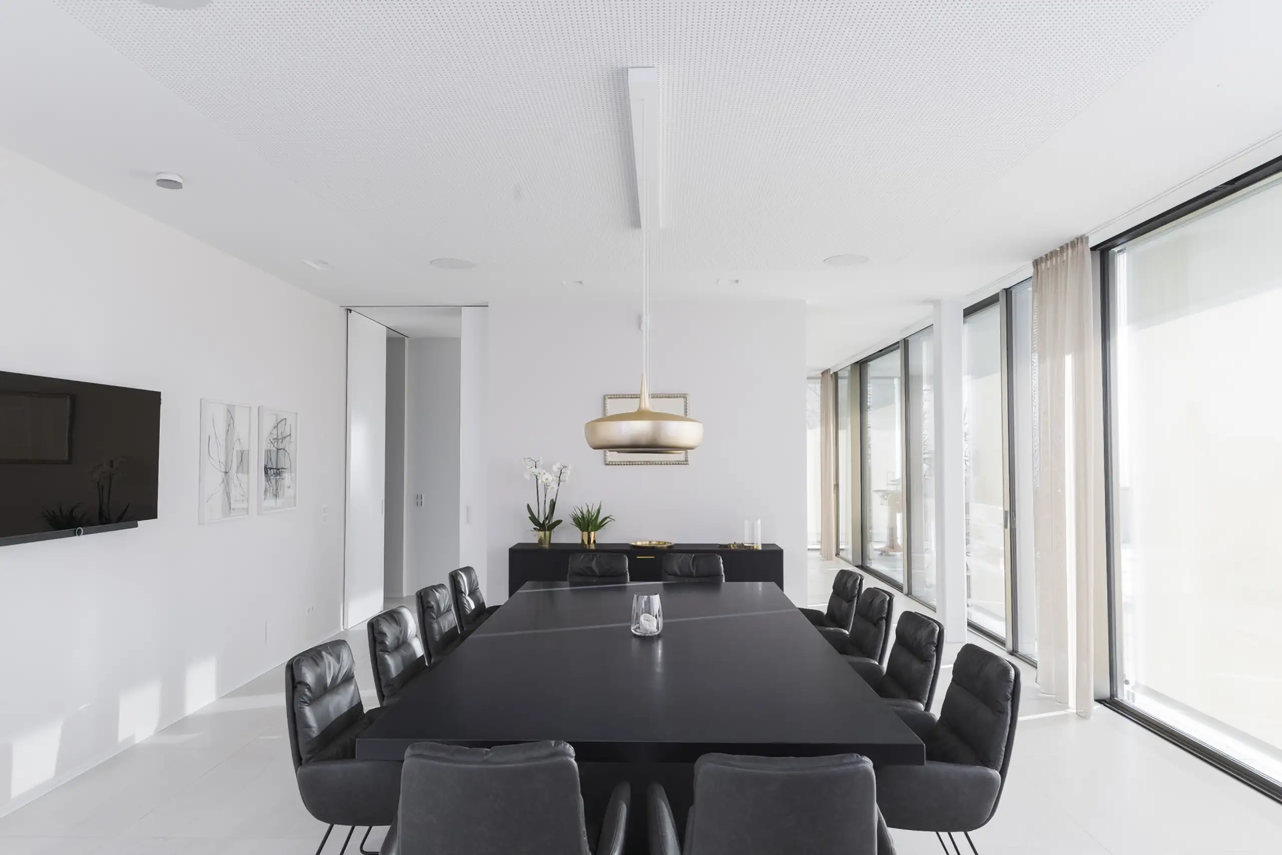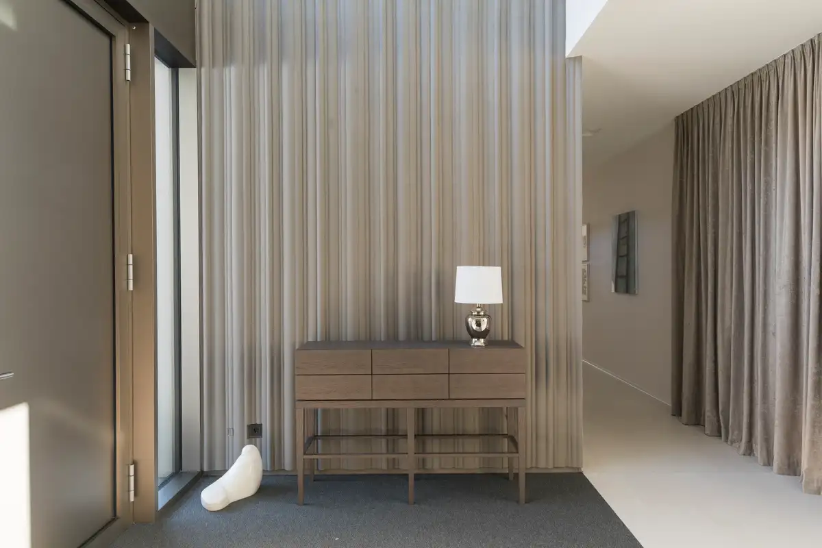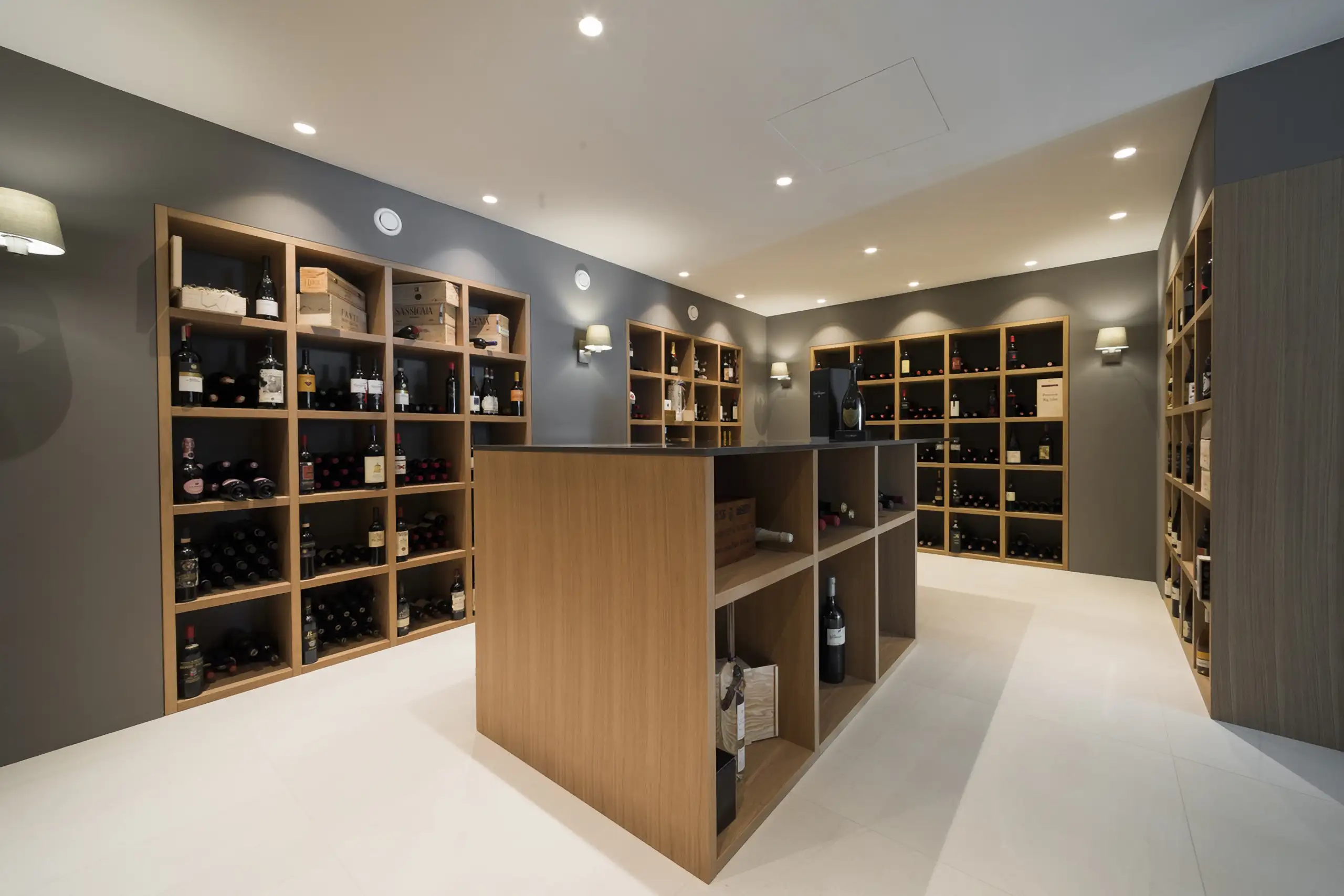 Neizpeta kombinacija bele in temnega furnirja tvori brezčasno osnovo, ki jo dopolnjujejo natančno izvedeni spoji robov posameznih elementov. Elegantne linije delujejo sodobno in prefinjeno, njihovo lahkotnost pa uravnoteža masivnost kubusnih pultov, ki prostoru dodajo stabilnost.