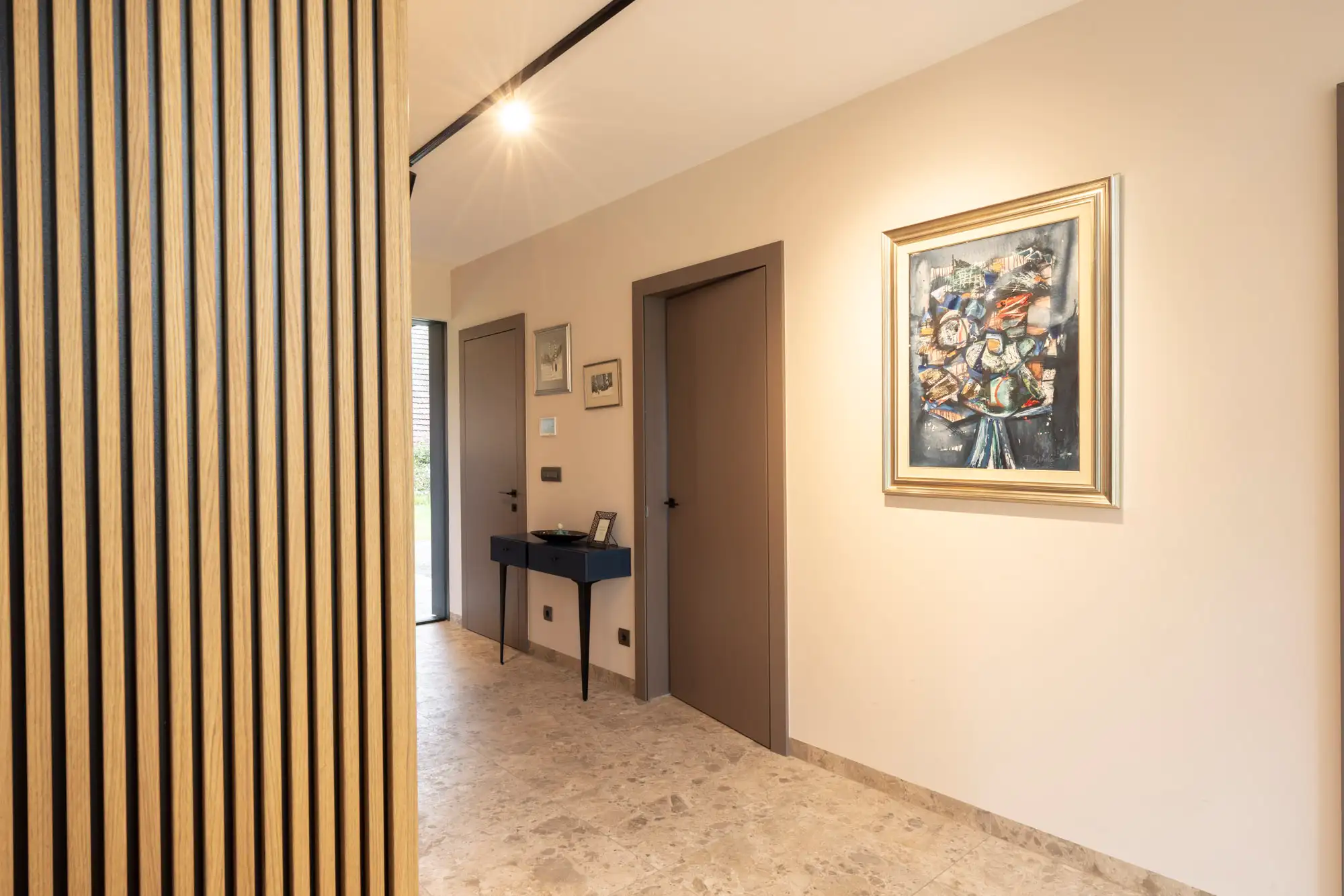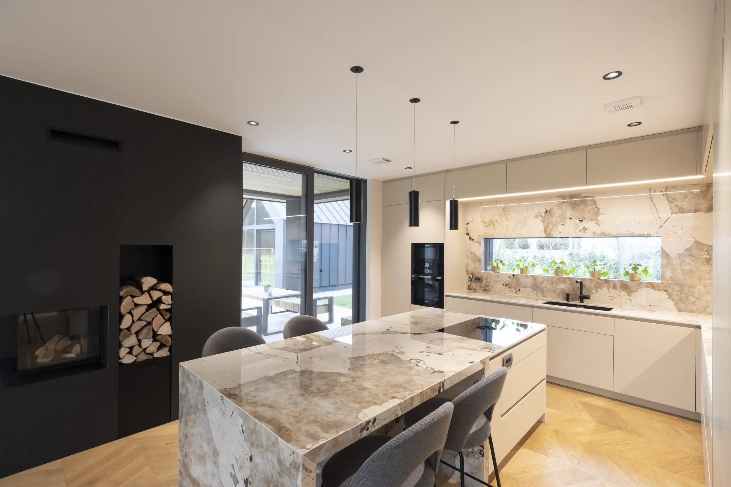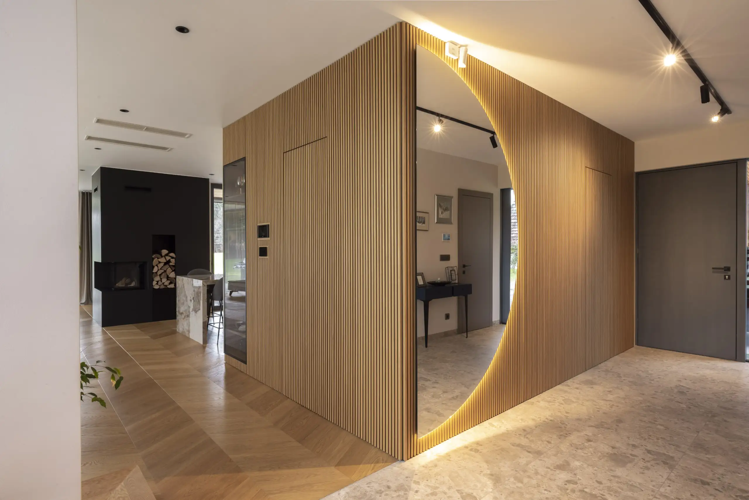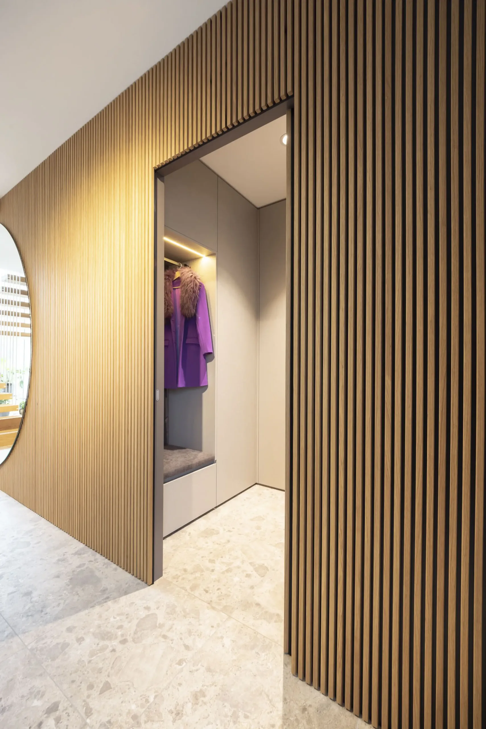 V projektu so uporabljeni naravni materiali in svetli odtenki pohištva. Posebno oblikovani elementi se kažejo v predsobi in kuhinji.