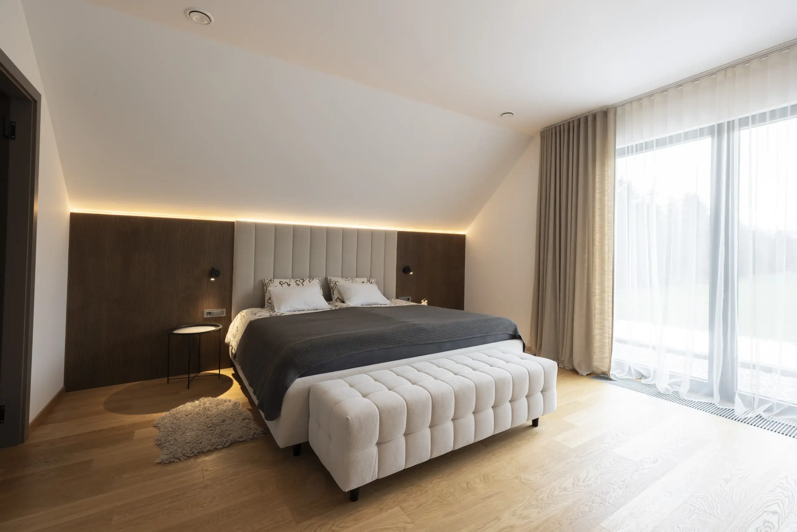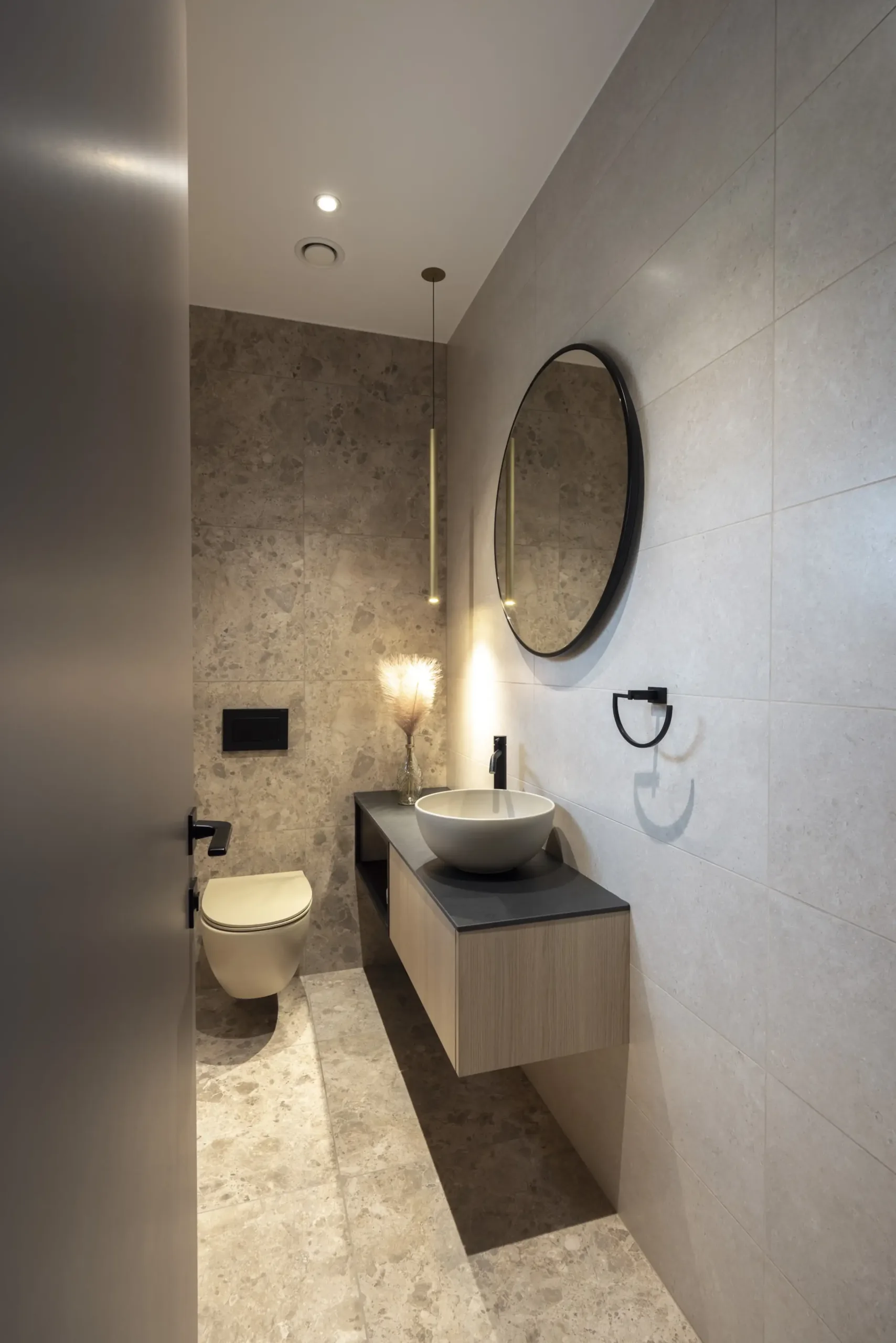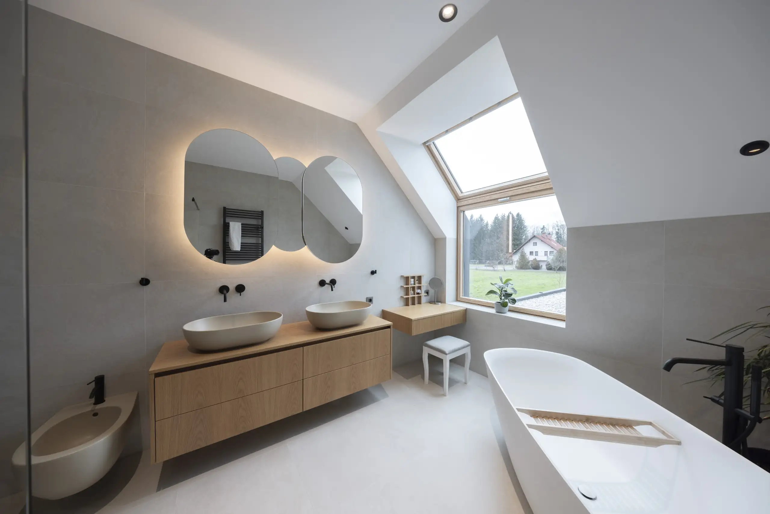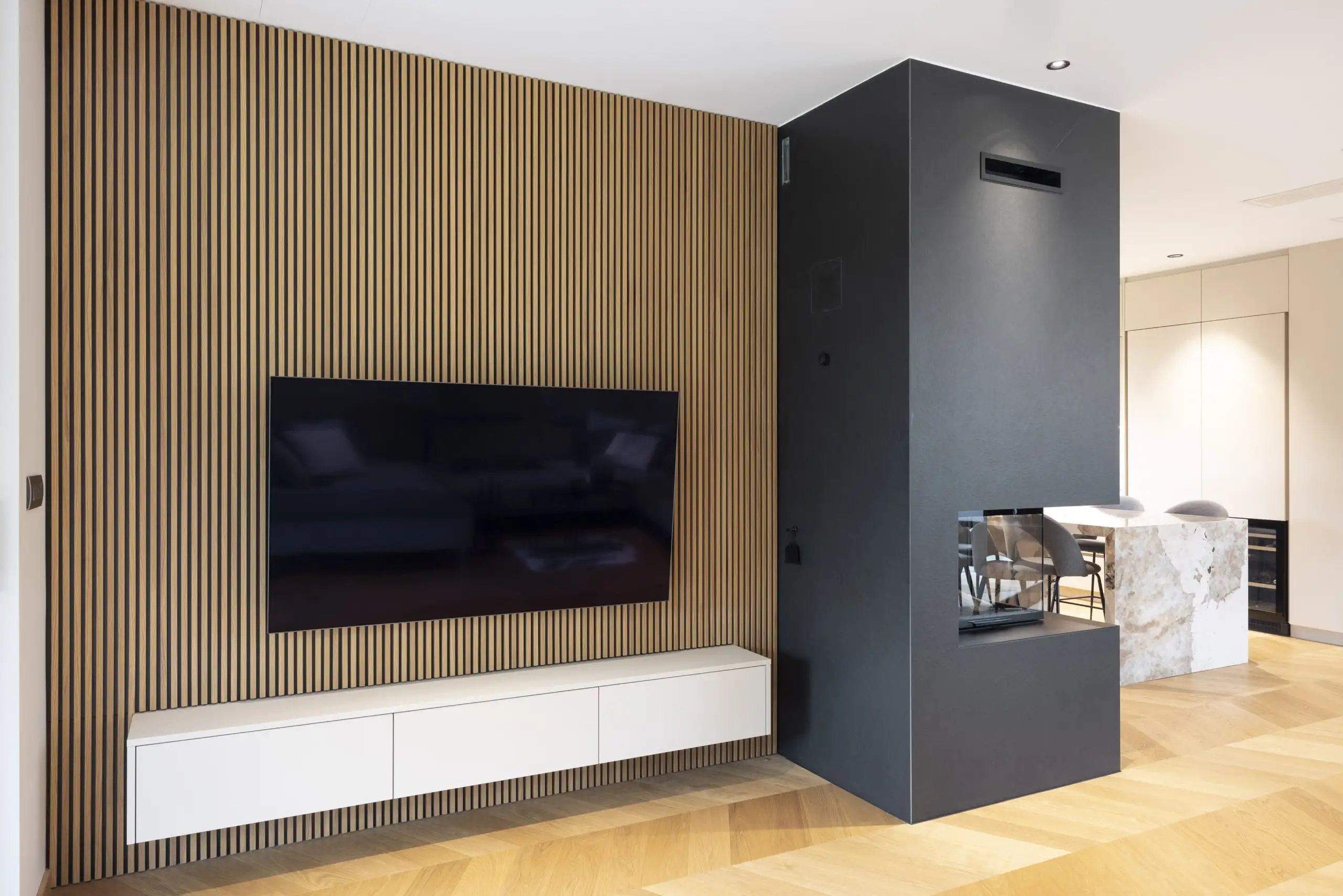 V projektu so uporabljeni naravni materiali in svetli odtenki pohištva. Posebno oblikovani elementi se kažejo v predsobi in kuhinji.